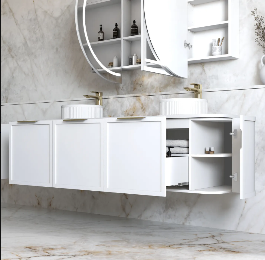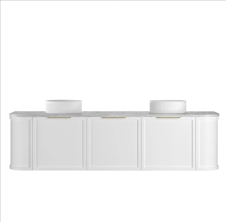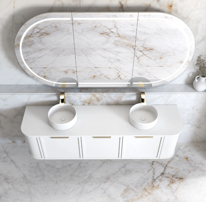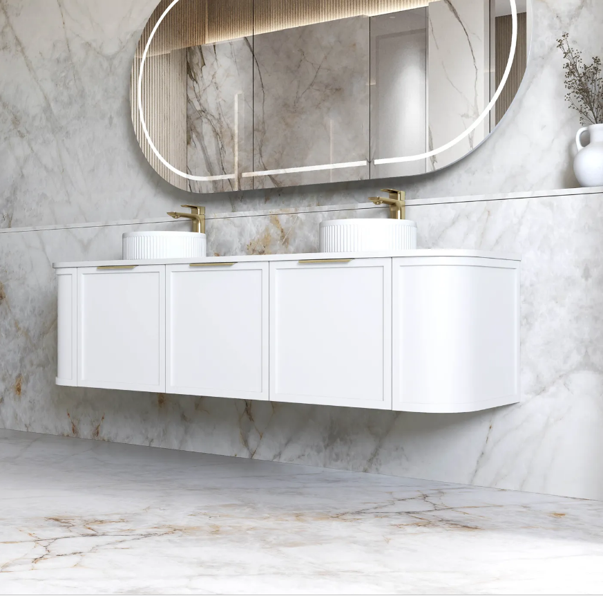 Drawing from classic furniture design, the soft panelled curved vanity is part of the latest in