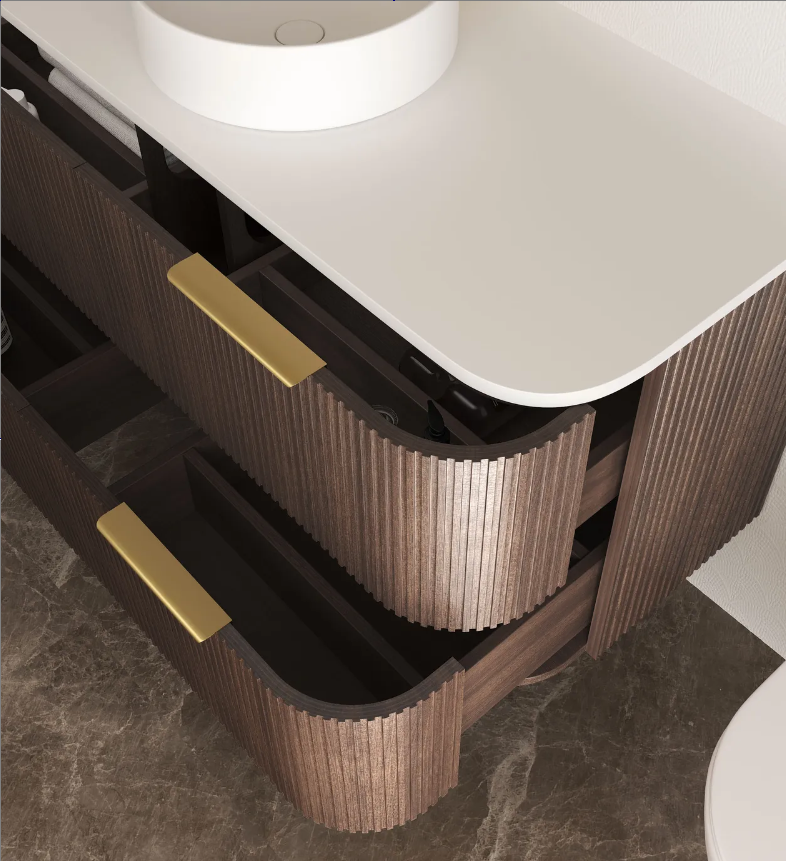 Our Havana Sable Walnut vanity is meticulously crafted from high water-resistant plywood, beautifully adorned with Oak timber veneer. Unlike the majority of timber-look fluted vanities constructed with MDF and PVC film, ours excels in durability, resilience against water damage, and resistance to peeling. Its extended lifespan and superior tactile feel establish it as the pinnacle of quality, distinguishing it in the market.