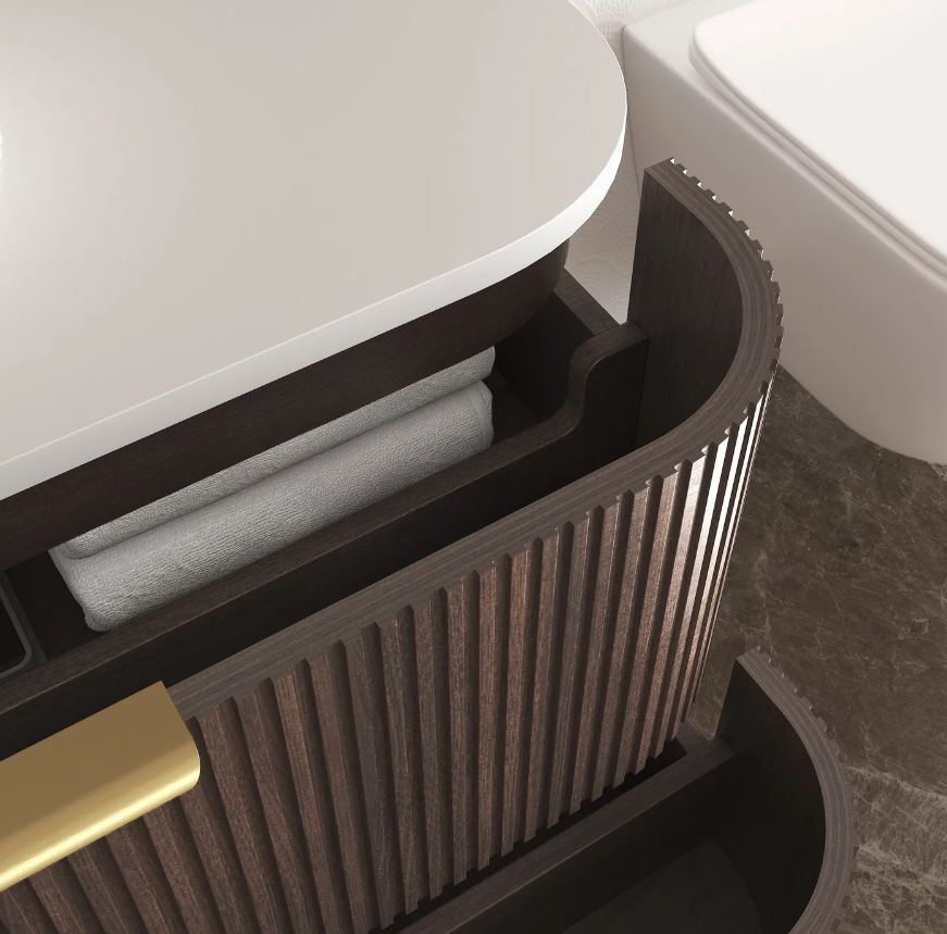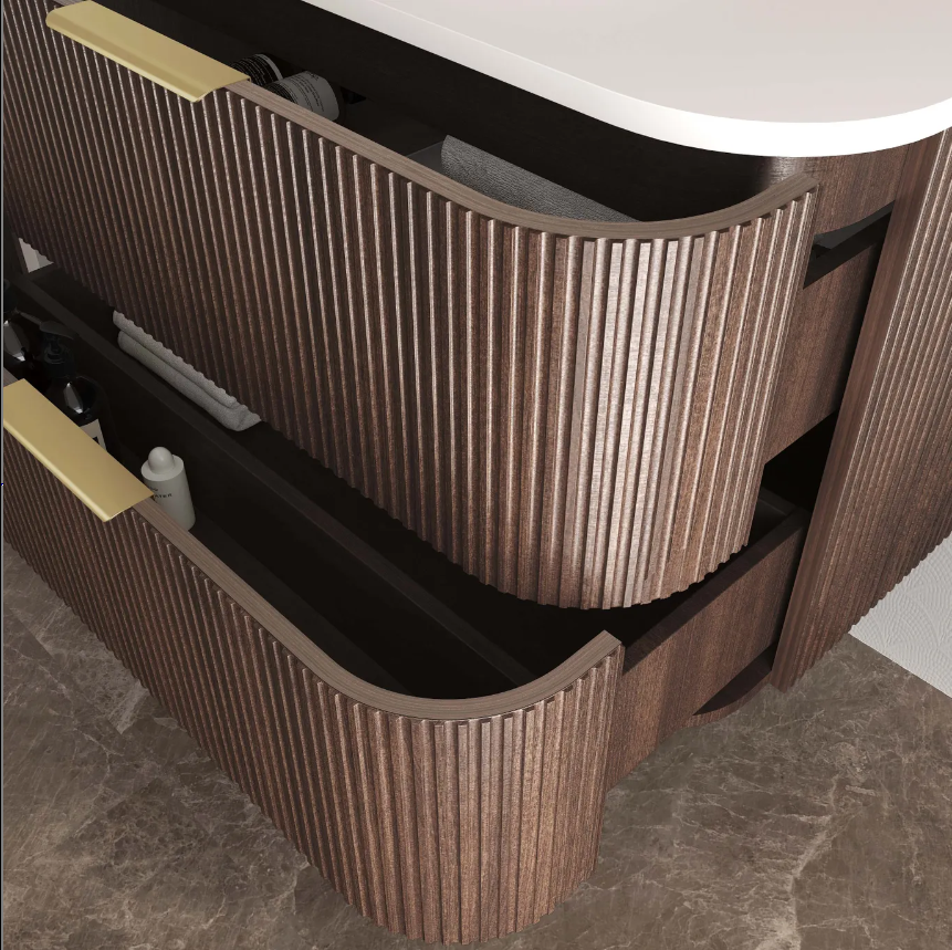 Our Havana Sable Walnut vanity is meticulously crafted from high water-resistant plywood, beautifully adorned with Oak timber veneer. Unlike the majority of timber-look fluted vanities constructed with MDF and PVC film, ours excels in durability, resilience against water damage, and resistance to peeling. Its extended lifespan and superior tactile feel establish it as the pinnacle of quality, distinguishing it in the market.