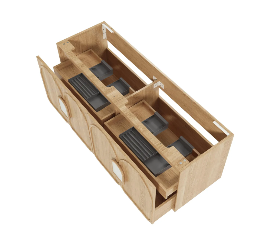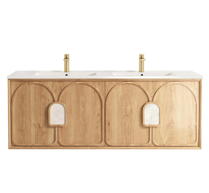 Natural Properties Our vanities are crafted with a natural timber look finish, providing a beautiful and authentic wood texture that adds warmth and character to any bathroom space. While we take every precaution to ensure colour consistency across our products, the inherent qualities of natural timber can cause slight variations in staining. This is due to the unique way each piece of wood responds to the staining process, making every vanity one of a kind. These natural differences are a feature of the product, adding to its charm and individuality. |
