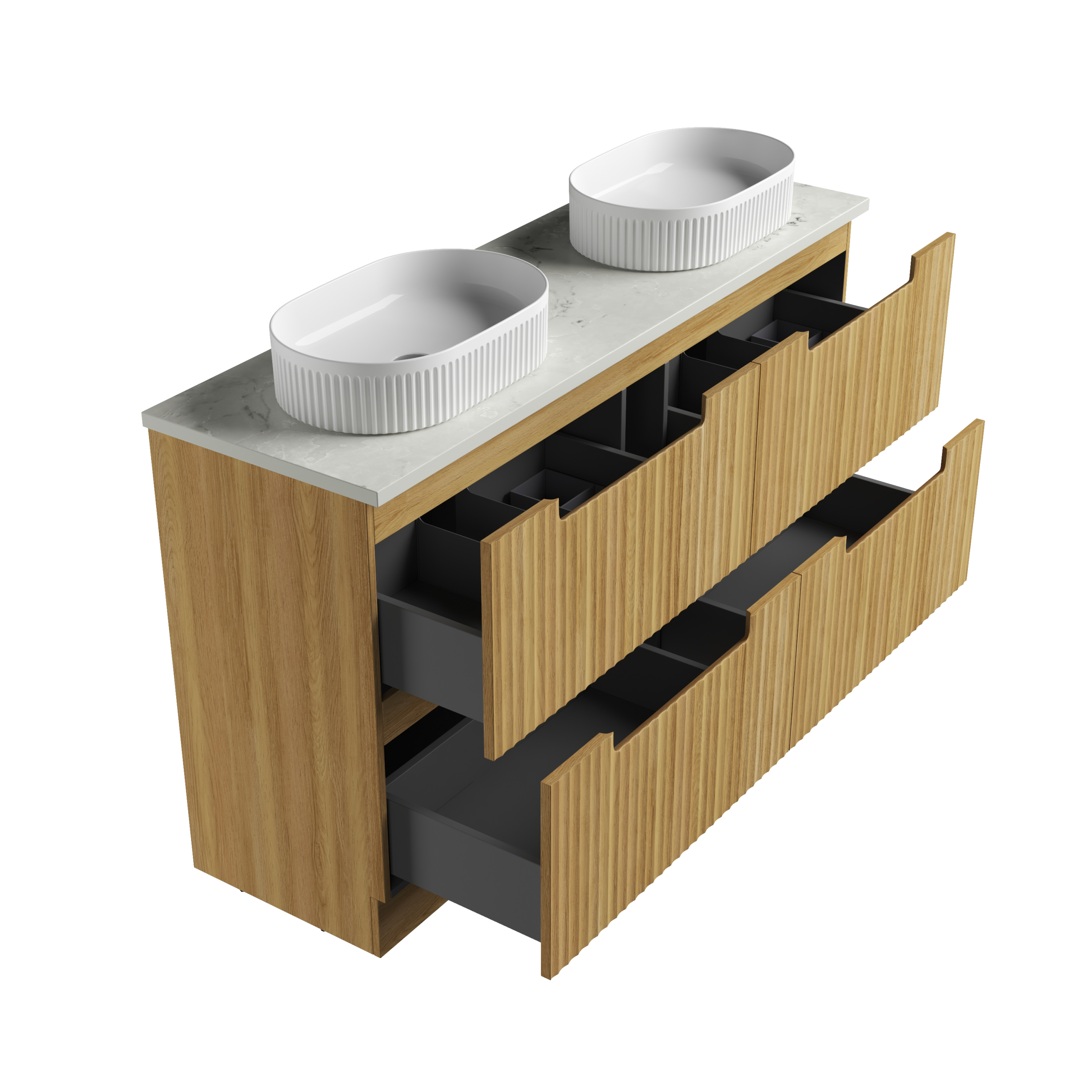 The Lovina floor-standing vanity showcases natural sophistication with its Harvest Oak wave groove design. Its spacious stacked drawers offer versatile storage, while Hettich Quadro S soft-close runners ensure seamless functionality. A perfect match for serene, light-filled bathrooms.