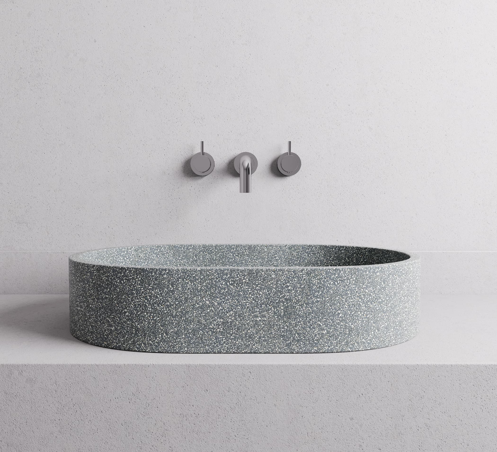 Introducing the Margo Basin, a stunning addition to our collection of Terrazzo Stone Basins. With its sleek oval shape, this basin offers a perfect balance of form and function, making it a versatile and timeless choice for any bathroom.