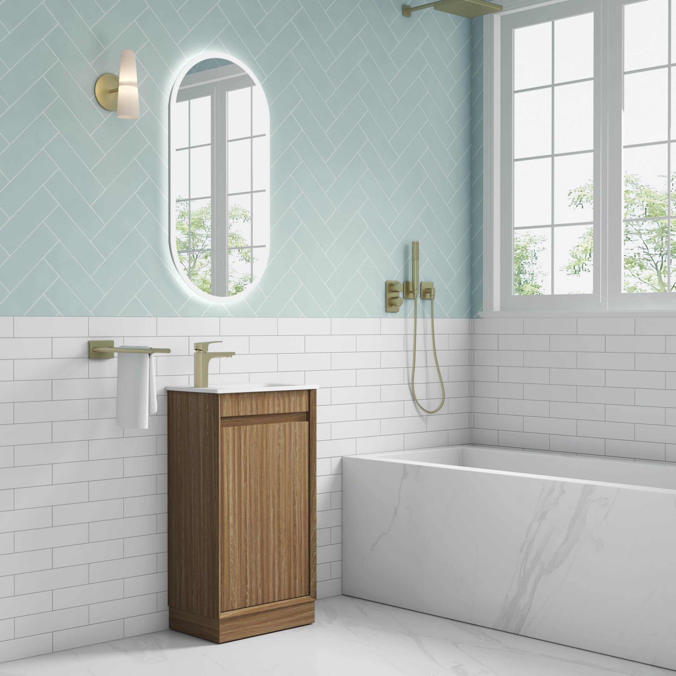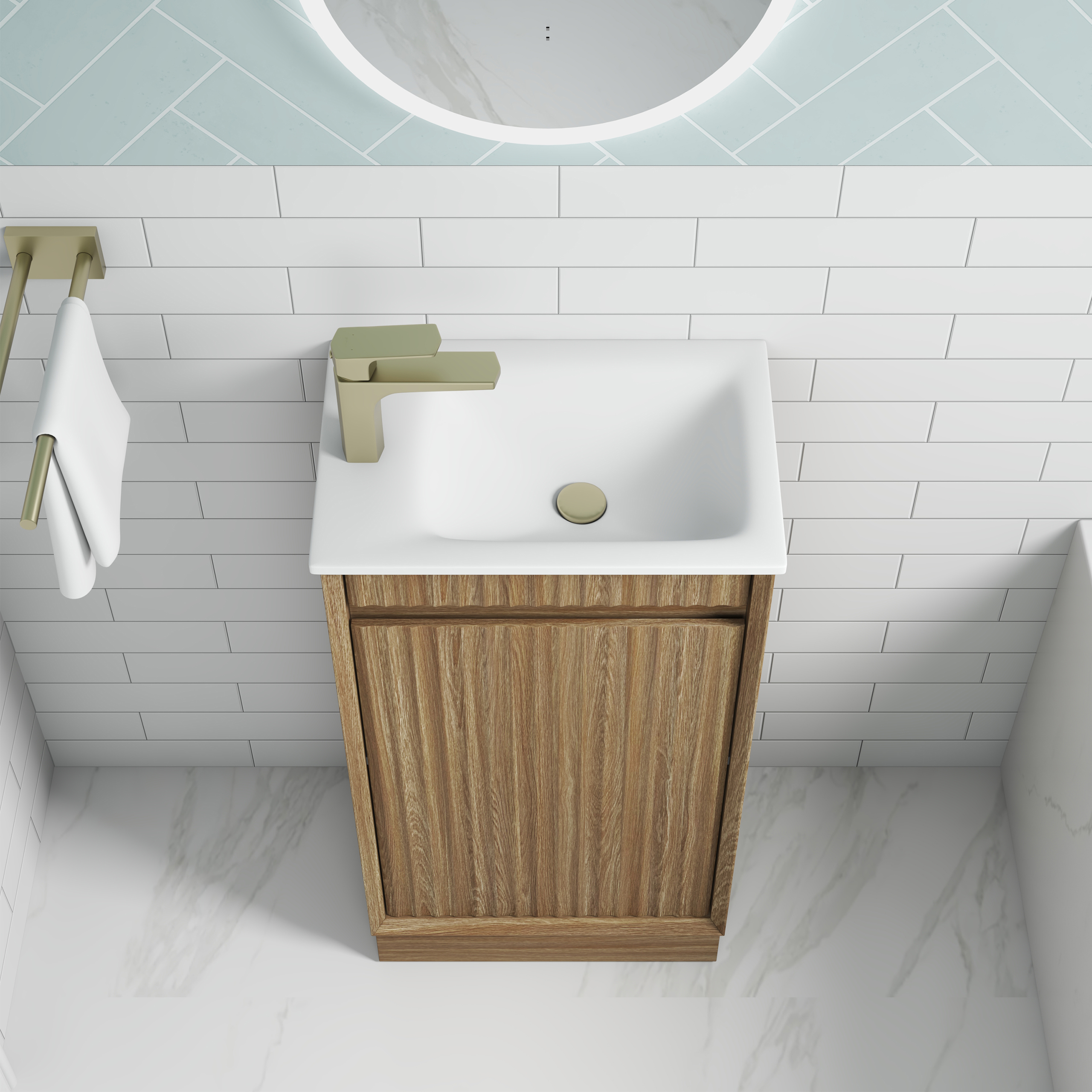 This Mini Vanity is a stylish space-saver with a big design impact. Featuring a refined bevel edge design and crafted from premium-grade, durable timber plywood, it delivers both strength and elegance. The contemporary wave groove in thermo laminate harvest oak colour finish adds rich texture and visual depth, while minimalist finger pull drawers maintain a clean, modern profile. Inside, a premium graphite interior offers a touch of luxury and smart storage—perfect for compact bathrooms that don’t compromise on style.