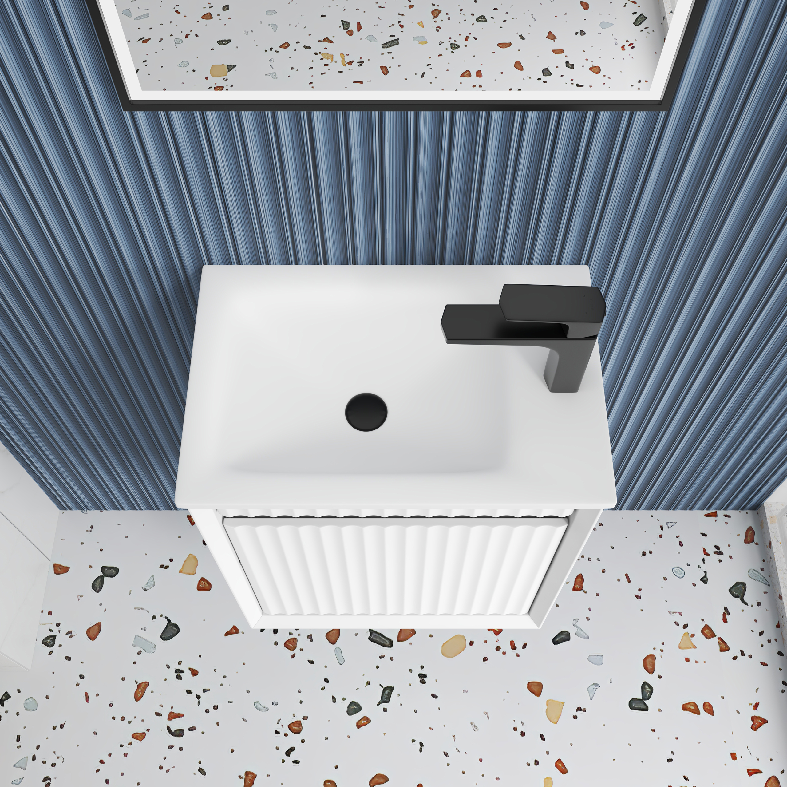 This mini wall-hung vanity combines sleek design with smart storage solutions. Crafted from premium-grade, durable timber plywood, it features a clean bevel edge design and a contemporary peaked ripple polyurethane finish in crisp matte white. The minimalist L-rail finger pull drawers enhance its streamlined, floating look, while the premium graphite interior adds a refined contrast. Perfectly sized for compact spaces, this versatile vanity offers spacious storage without compromising style.
