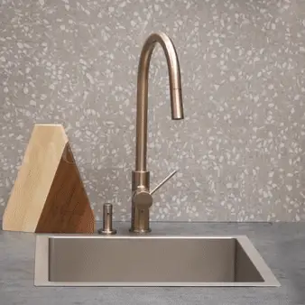 This pull-out kitchen mixer is available in a range of premium finishes — Matte Black, Tiger Bronze, Champagne, Shadow Gunmetal, Brushed Nickel, Lustre Bronze and Polished Chrome — allowing you to match or elevate your kitchen aesthetic with the ideal tone:
