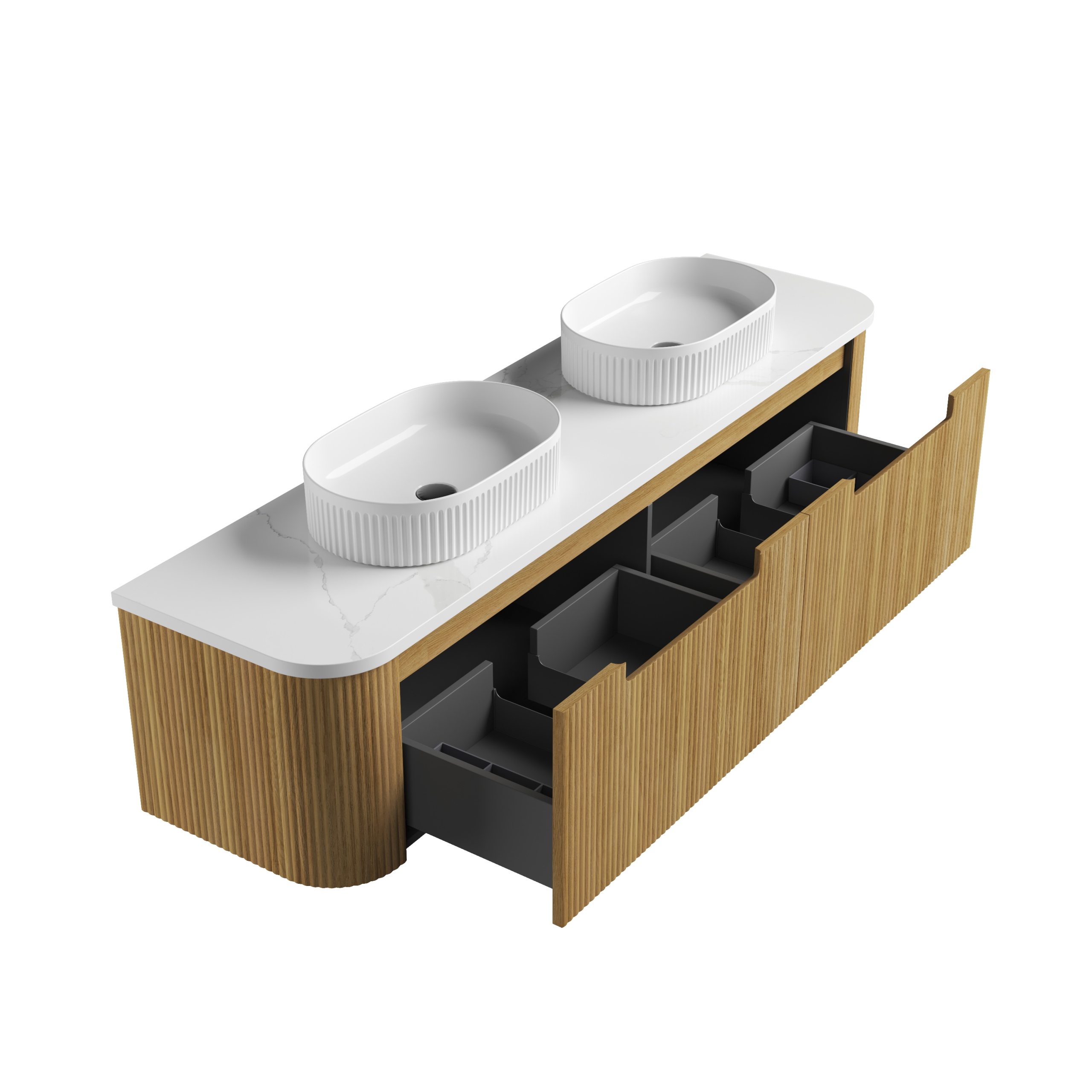 The Varcelli Mono Wall Hung Vanity complements modern bathroom aesthetics with its curved ends and sleek, floating design. Crafted from durable timber plywood in a warm Harvest Oak V-groove finish, it pairs beautifully with natural textures and soft lighting. Its spacious, soft-close drawers with graphite interiors and integrated organizers ensure effortless functionality.