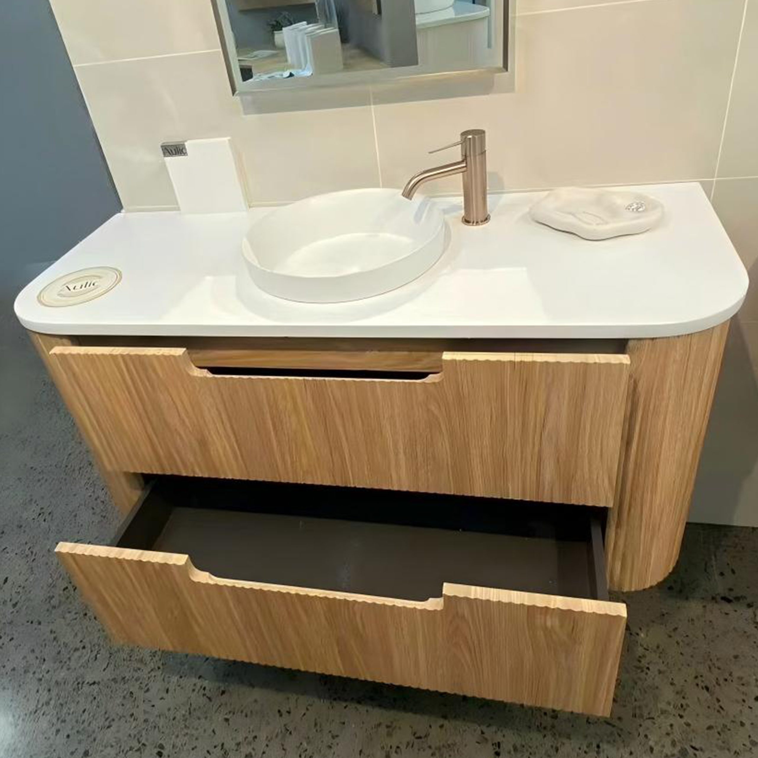 The Varcelli Tier Wall Hung Vanity is a stunning fusion of elegance and functionality. Its curved feature ends and ribbed Harvest Oak finish add warmth and texture, while the spacious all-drawers design ensures maximum storage. Equipped with Hettich Quadro S soft-close runners, premium graphite interiors, and integrated organizers, it’s crafted for modern living.