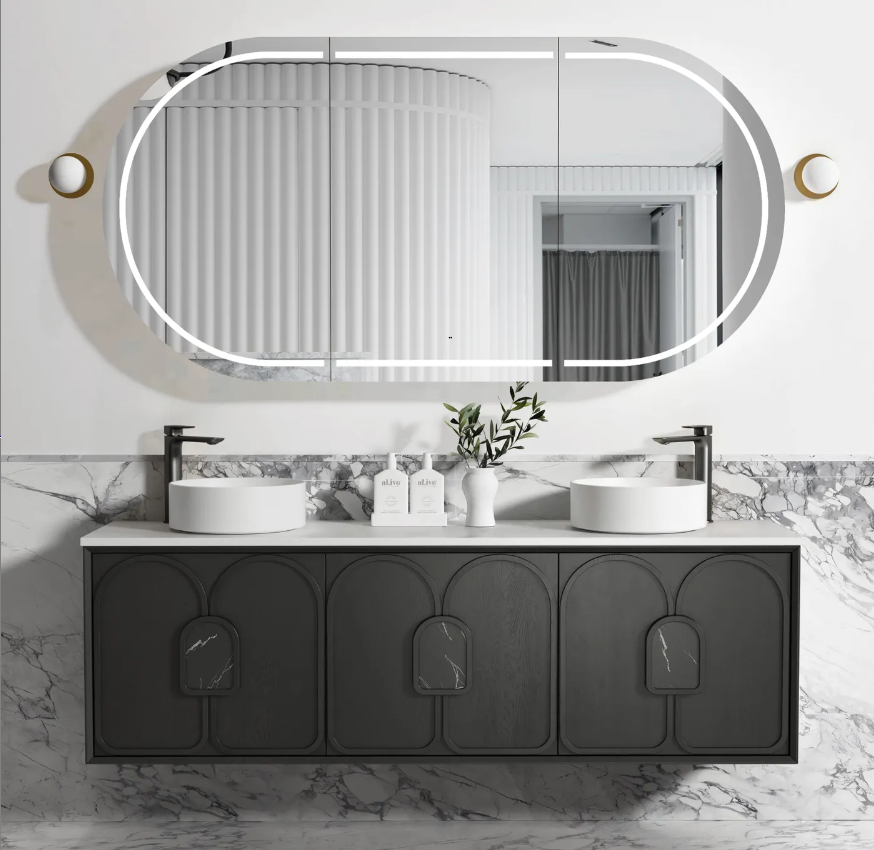 Our vanities are crafted with a natural timber veneer finish, providing a beautiful and authentic wood texture that adds warmth and character to any bathroom space.
